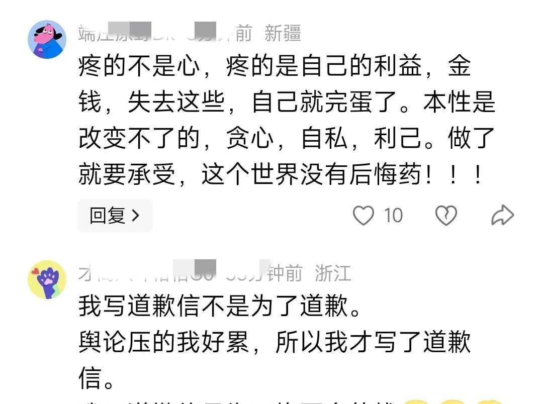不过,这两个观点也都是代表了网友们的观点,代表不了闫学晶的真实想法。谁能真的了解闫学晶发文致歉的真实想法是真心认错还是为了利益被迫低头呢?
