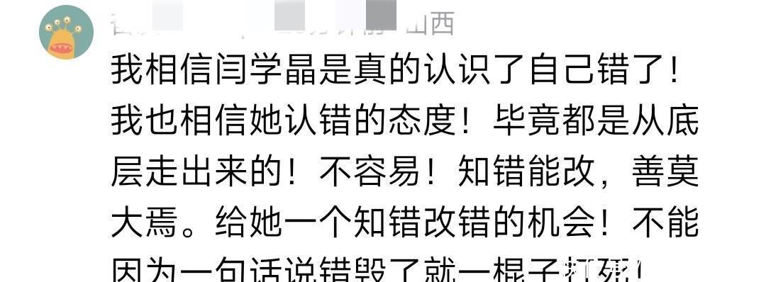 现在闫学晶也是真的认识到了自己的错误,而且她是从底层走出来的,也不容易,就给她一个知错改错的机会,不要因为一句话就一棍子打死,让她失去翻身的机会。这一派的观点说得有一定道理,但却说不服所有人,而且另一派的观点理由显然更充分一点。